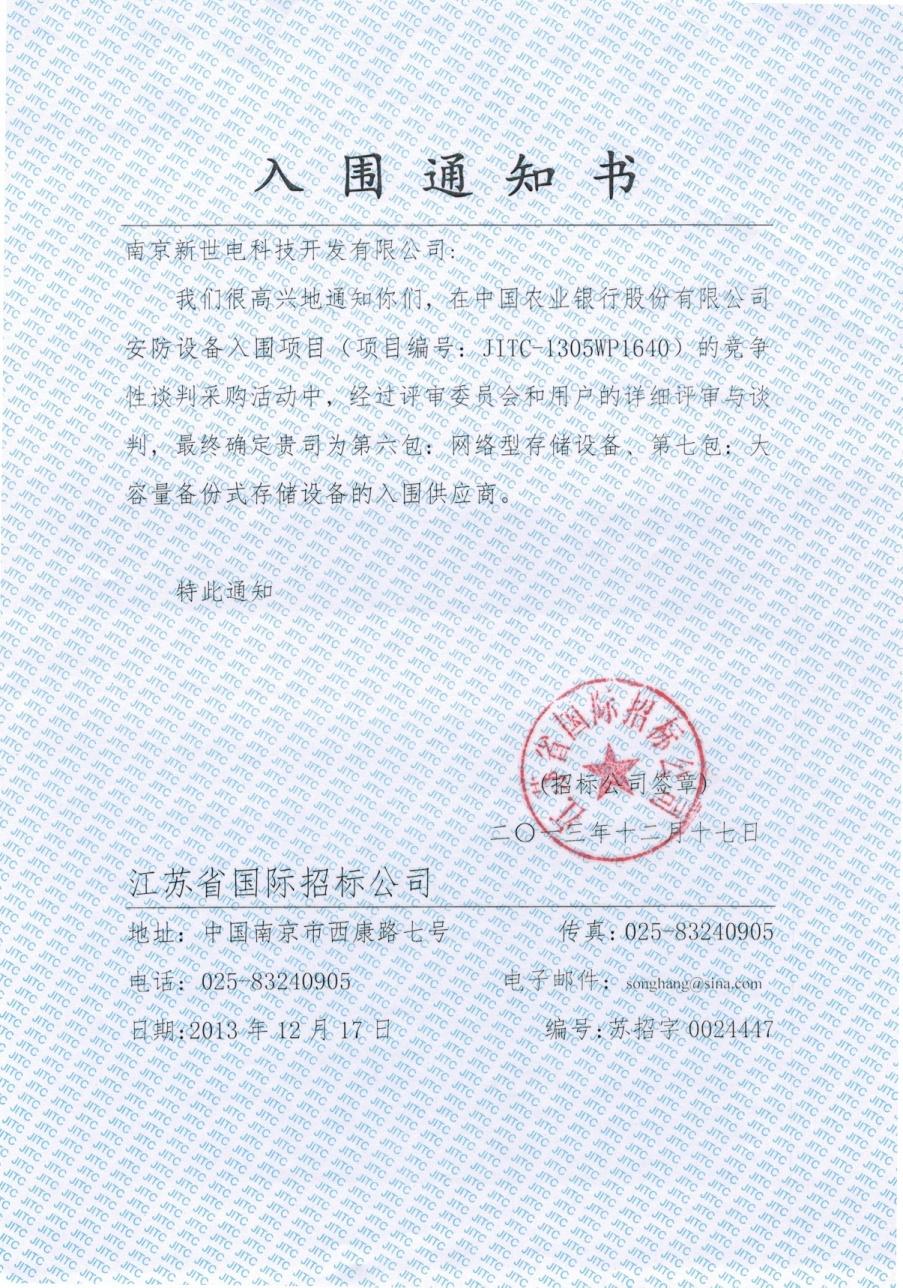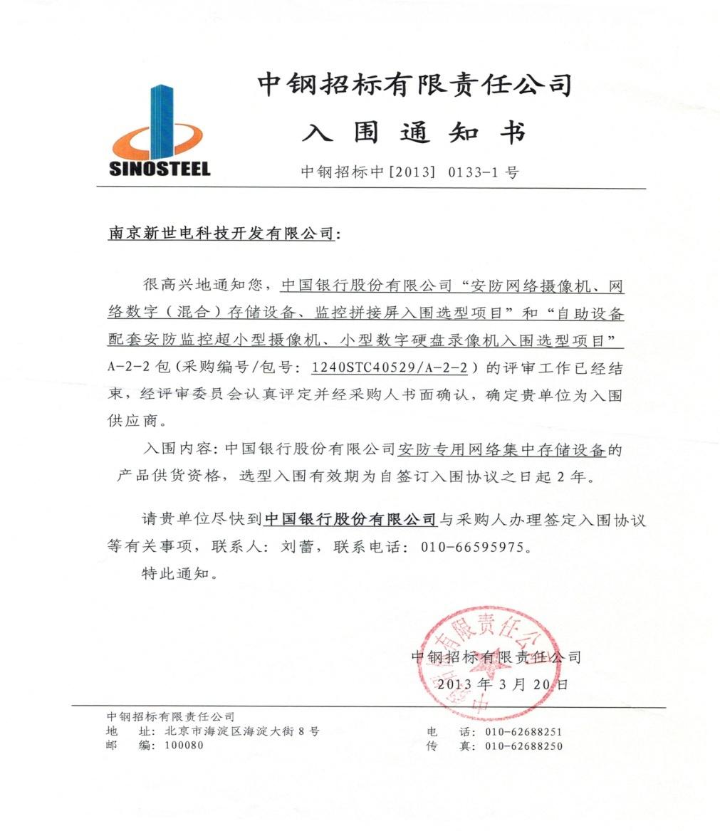 2013年3月20日,公司接到中國(guó)銀行總行通知,新世電在中國(guó)銀行股份有限公司“安防網(wǎng)絡(luò)攝像機(jī)、網(wǎng)絡(luò)數(shù)字(混合)存儲(chǔ)設(shè)備、監(jiān)控拼接屏入圍選型項(xiàng)目”和“自助設(shè)備配套安防監(jiān)控超小型攝像機(jī)、小型數(shù)字硬盤錄像機(jī)入圍選型項(xiàng)目”A-2-2包(采購(gòu)編號(hào)/包號(hào)1240STC40529/A-2-2)的競(jìng)爭(zhēng)性談判采購(gòu)中,經(jīng)評(píng)審委員會(huì)認(rèn)真評(píng)定并經(jīng)采購(gòu)人書面確認(rèn),確定新世電為入圍供應(yīng)商,入圍內(nèi)容:中國(guó)銀行股份有限公司安防專用網(wǎng)絡(luò)集中存儲(chǔ)設(shè)備的產(chǎn)品供貨資格,選型入圍有效期為自簽訂入圍協(xié)議之日起2年。